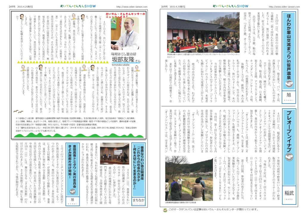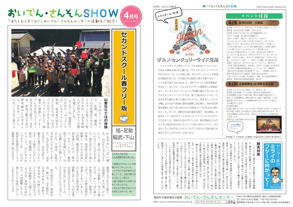 おいでん・さんそんSHOW 2015年4月号 2026 2/05 おいでん・さんそんセンター通信 バックナンバー レポートファイル 下山地区 旭地区 稲武地区 足助地区 2015年4月25日 2015年4月号は、「セカンドスクール春フリー版」の話題をご紹介します。 2015年4月号PDF おいでん・さんそんセンター通信 バックナンバー レポートファイル 下山地区 旭地区 稲武地区 足助地区 おいでん・さんそんSHOW セカンドスクール よろしかったらシェアしてくださいね URLをコピーしました! 「きよみ旅館物語」スタート! 「人と木をつなげるプロジェクト」マイ箸作りのワークショップ おすすめ記事 【募集】3/15(日)小渡城跡 歴史探訪と里山プチトレッキング 2026年3月6日 【募集】3/25~28(水木金土) 麴から醸す、おしょうゆづくり 2026年3月3日 【募集】3/28(土) 五感で楽しむ、おしょうゆしぼり 2026年3月3日 【募集締切3/30】お米作り体験 2026年3月2日 【募集】山里ひとなる塾 第4期生募集説明会 2026年3月1日 トヨタ車体㈱・森人が山村地域とともに育む森林保全のかたち 2026年2月25日 【募集】3/26(木) ひなまつりの会🌸 2026年2月19日 【募集】4/4(土) 第2回 はじめての「ニワトリの飼い方講座」 2026年2月17日