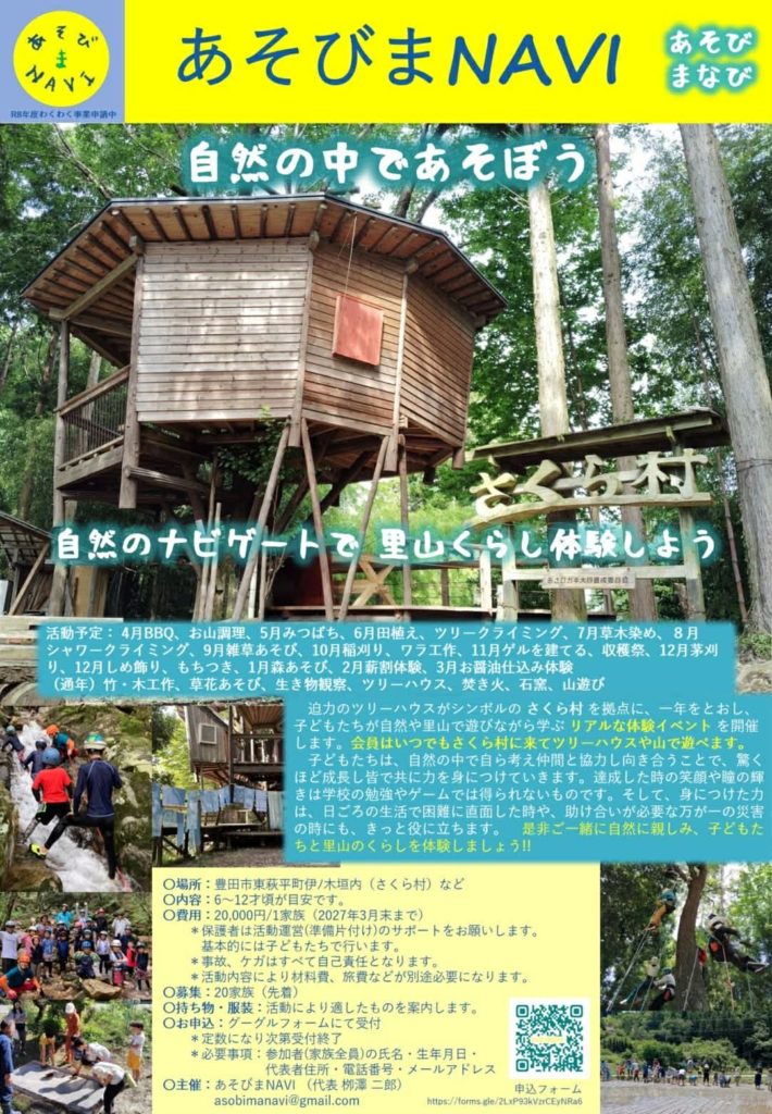 迫力のツリーハウスがシンボルの さくら村 を拠点に、一年をとおし、子どもたちが自然や里山で遊びながら学ぶ リアルな体験イベント を開催します。