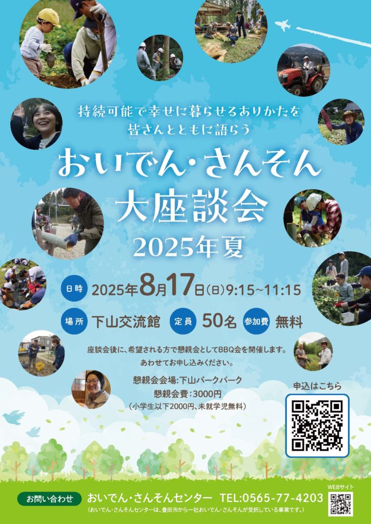 今回、集まった人たちの自由な語らいの中から、深い学びと気づきが得られる時間を共有していきたいと思い、おいでん・さんそん大座談会を企画しました。都市から山村まで多様な人たちが重なりながら日々の生活が営まれている豊田で、持続可能で人々が幸せに暮らせるありかたを皆さんとともに模索していきたいと思います。