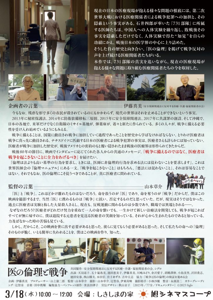月イチ映画上映会 3月は映画『医の倫理と戦争』を上映します!