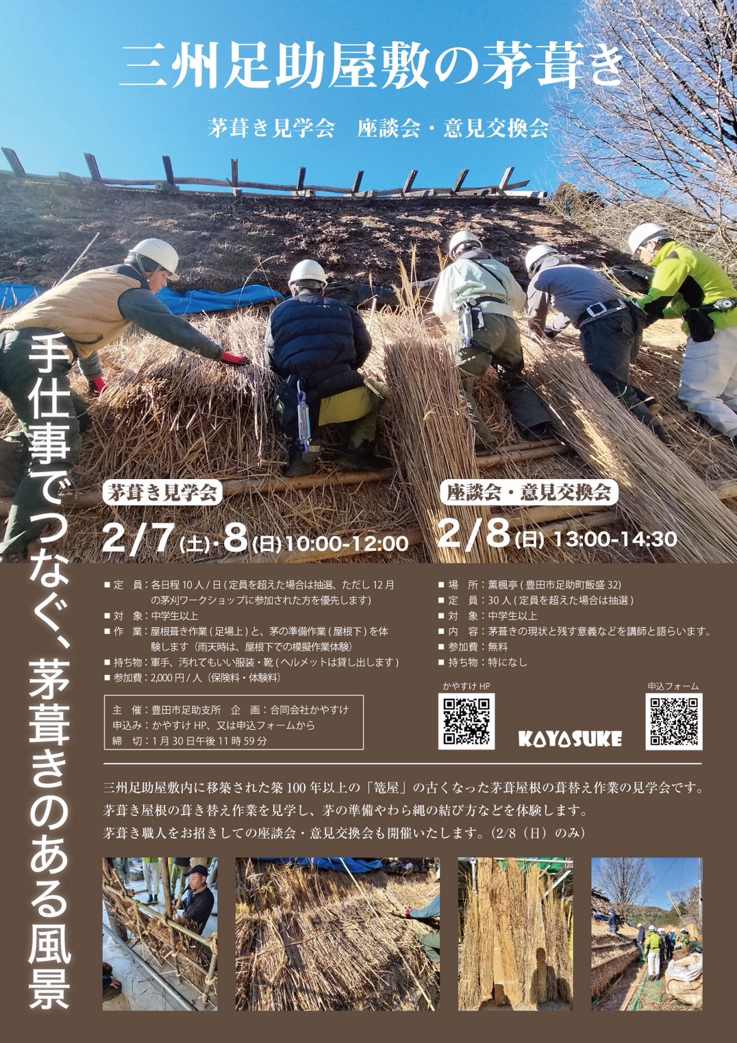 豊田市・三州足助屋敷で、移築された「篭屋」の屋根を葺き替える貴重な見学会&座談会!