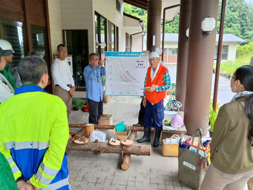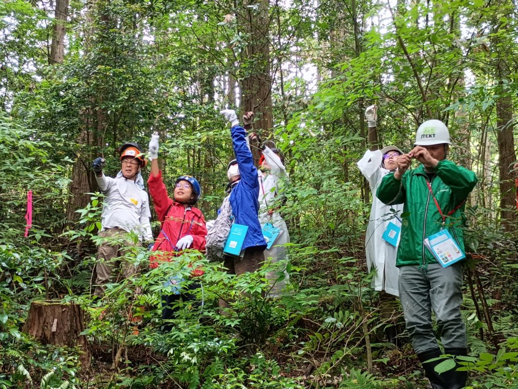 2025年4月、ジェイテクトより、社員教育として環境意識向上を目的とした体験型プログラムを行いたいと相談を受けました。おいでん・さんそんセンターが調整役となり、旭木の駅プロジェクトとのマッチングおよびプログラム設計を行う中で、森の健康診断出前隊も連携し、「森の健康診断」を軸とした環境教育プログラムを企画しました。関係者との協議を重ね、6月28日に現地でプログラムを実施。当日は雨天のため一部内容を短縮しましたが、ジェイテクト社員とその家族が参加し、森林の状態観察を通じて、手入れの重要性や持続的な森林管理について理解を深めました。終了後には地域との交流の場も生まれ、企業と地域団体をつなぐ協働事例となりました。