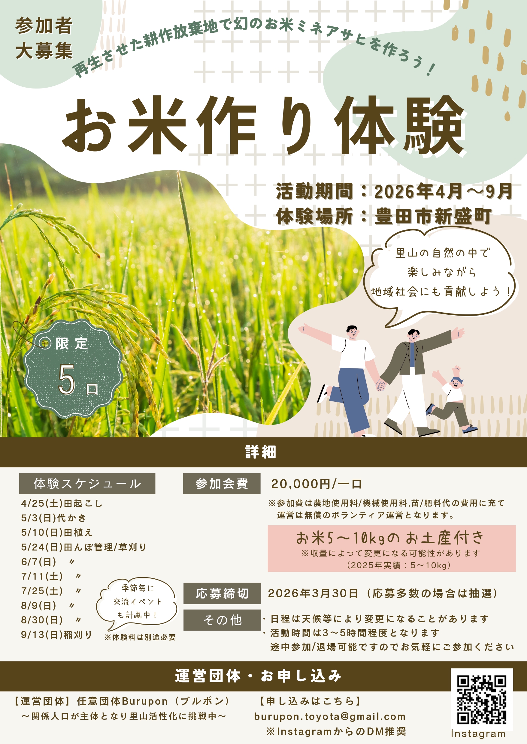 ※参加費は農地使用料/機械使用料,苗/肥料代の費用に充て運営は無償のボランティア運営となります。