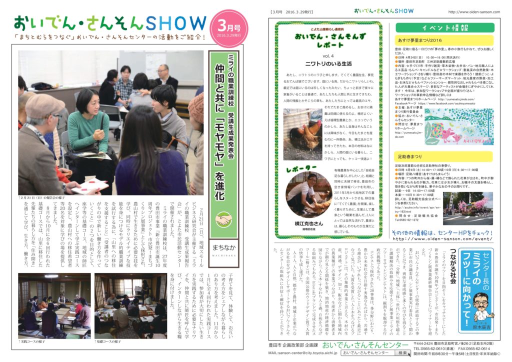おいでん・さんそんSHOW 2016年3月号 2026 1/16 おいでん・さんそんセンター通信 バックナンバー レポートファイル 豊田市全域 2016年3月29日 2016年3月号は、ミライの職業訓練校 受講生成果発表会、『仲間と共に「モヤモヤ」を進化』の話題をご紹介します。 2016年3月号PDF おいでん・さんそんセンター通信 バックナンバー レポートファイル 豊田市全域 おいでん・さんそんSHOW ミライの職業訓練校 よろしかったらシェアしてくださいね URLをコピーしました! “ツール・ド・ニッポン in 名古屋”の取材をしてきました。 「㈱ワイズ 我が社のわいわいファーム 」キックオフ会が開催されました! おすすめ記事 【女性限定】山村体験交流ツアー 実施報告 2026年1月27日 10/11(土) 「いい街発見 地方の暮らしフェア」に出展しました 2026年1月8日 【終了しました】1/25(日) おいでん・さんそん大座談会 2026年冬 2025年12月19日 11/22(土) 敷島自治区(旭地区)集落活動サポート 実施報告 2025年12月8日 10/19(日) 市平町(旭地区)集落活動サポート 実施報告 2025年10月22日 9/20(土) 岩下町(小原地区)集落活動サポート 実施報告 2025年10月21日 10/12(日) 中当町(稲武地区)集落活動サポート 実施報告 2025年10月16日 10/11(土) 富永町(稲武地区)集落活動サポート 実施報告 2025年10月16日