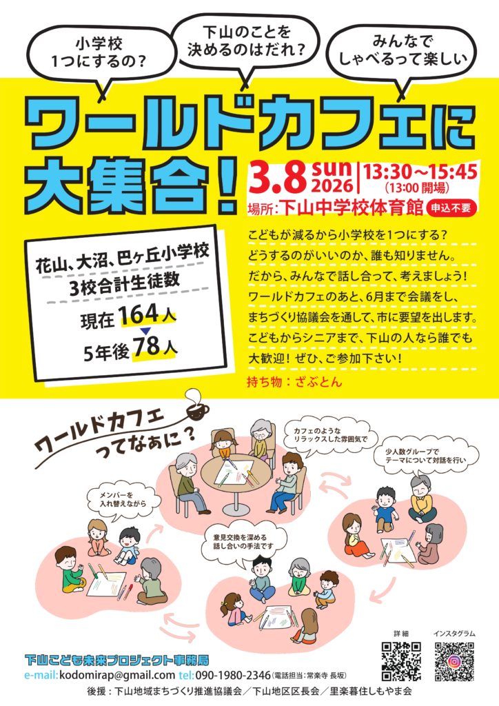 こどもからシニアまで、下山の人みんな集まって‼️難しいことはしません。みんなでどうなったらいいかを話して話して話したい。