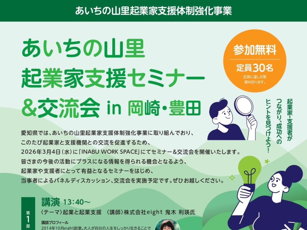 【募集】3/4(水) あいちの山里 起業家支援セミナー&交流会 in 岡崎・豊田